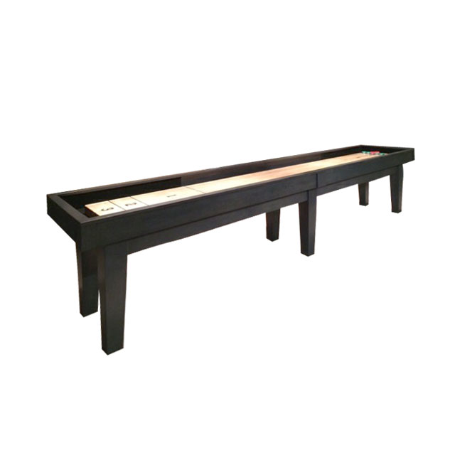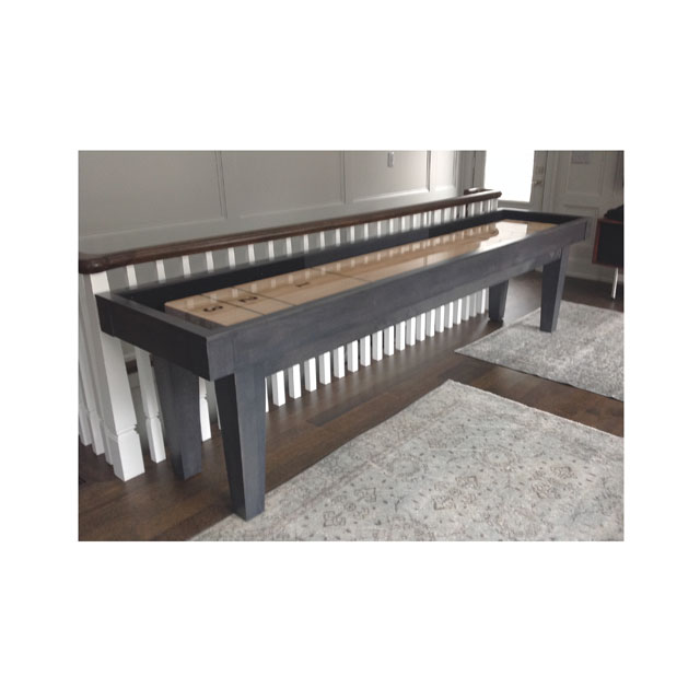 The full 9′ playing surface comes in a 4 legged version and the full 12′ playing surface comes in a 6 legged version. Tournament class shuffleboard rocks and wax are always included in the price. Shown in our newest smokey charcoal finish, our tables are also available in a variety of select woods and finishes.