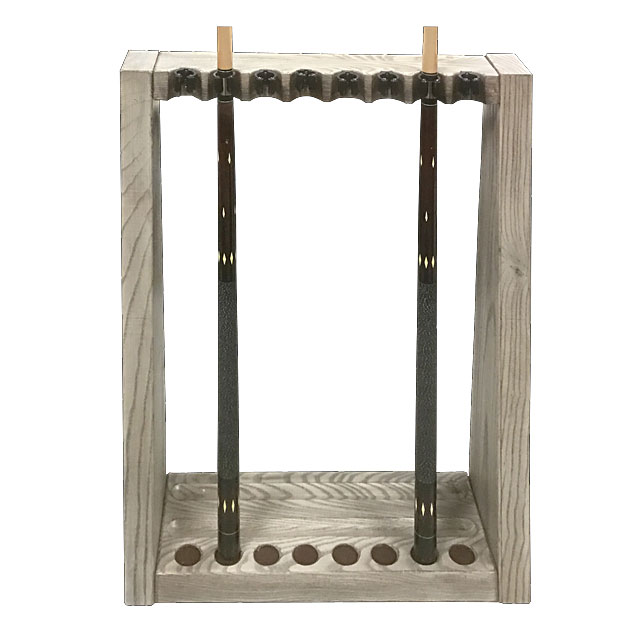 The Hazleton solid floor rack will hold up to 8 cues of various lengths and rest handles as well as boasting a ball caddy on the bottom accommodating 16 balls. This functional piece will also compliment most of our in house pool table designs as a stand alone statement.