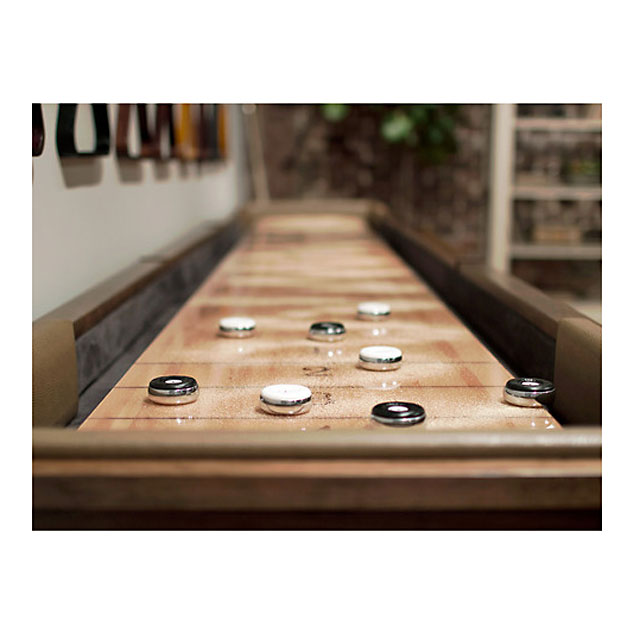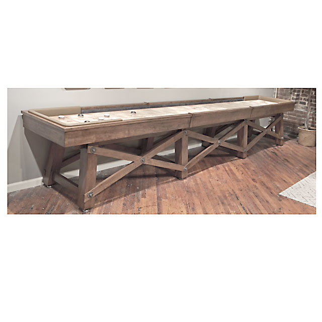 The Hazleton shuffleboard table was inspired by our Hazleton pool table design with a rustic rafter and beam aesthetic.